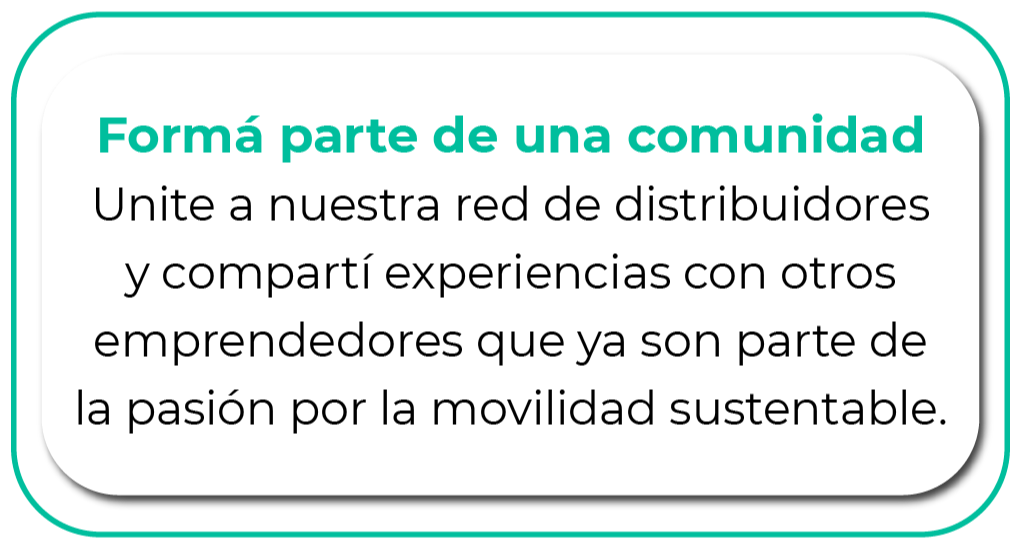 Aprovechá la creciente demanda de vehículos eléctricos y convertite en un referente en tu región. Posicioná tu negocio con los mejores productos de movilidad del mercado.¿Qué estás esperando para convertirte en revendedor de un sector en auge?Si sos emprendendor, distribuidor o revendedor minorista; te proporcionamos todo lo que necesitas para ampliar tu oferta y aumentar las ventas de tu negocio.